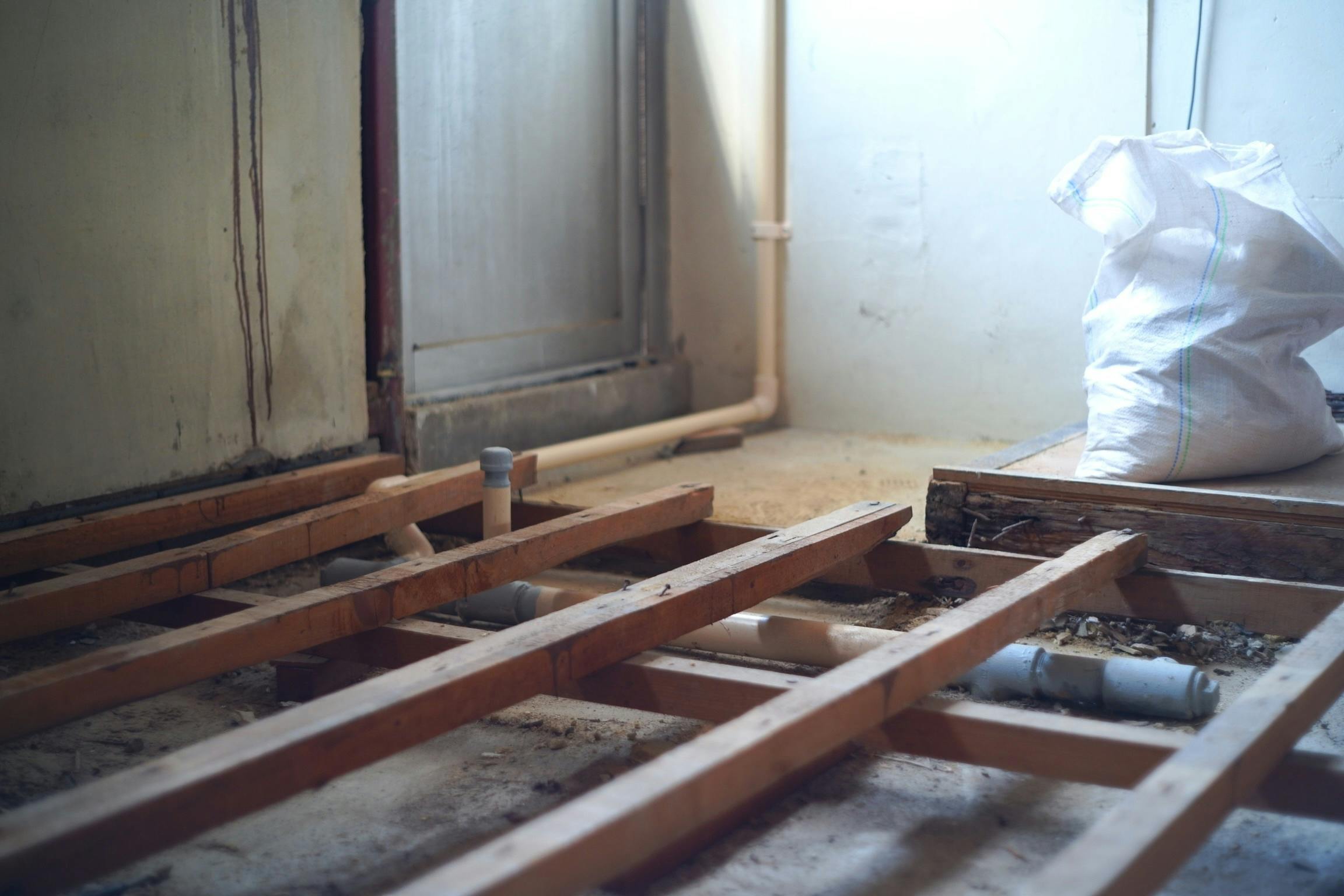 床を貼る為の下地、配管、それに電気配線。
