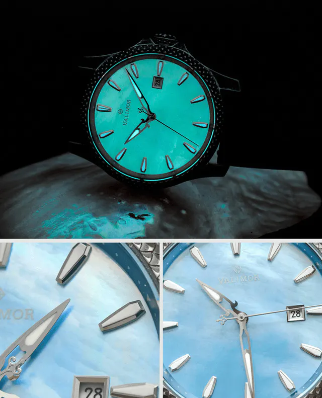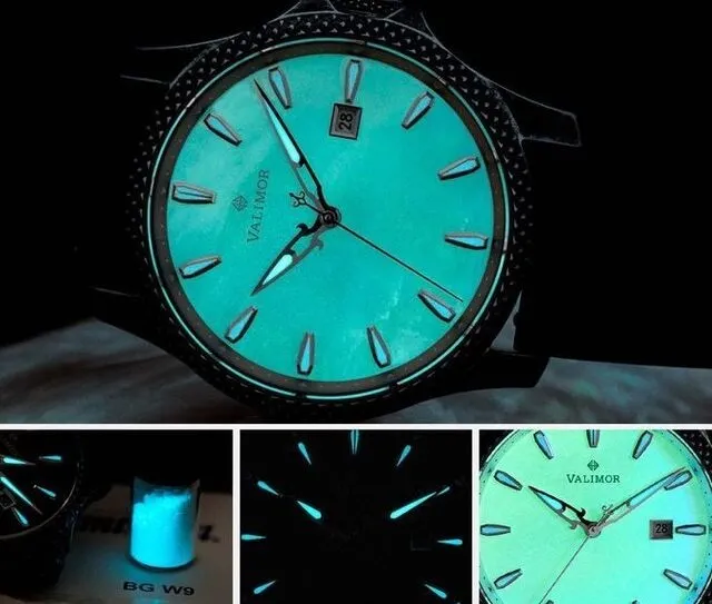 スイスの有名な「スーパールミノーバ BGW9」を夜光塗料に使用。昼間に太陽の光を吸収し、暗闇の中で針や文字盤がはっきりとした青色の光を発します。非放射性で害は無く何年にもわたって光り続けます。