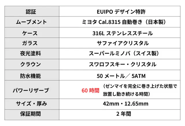 この価格帯では実現困難と言われていたパワーリザーブ60時間を実現し、海外のお客様に素晴らしい評価を頂きました。