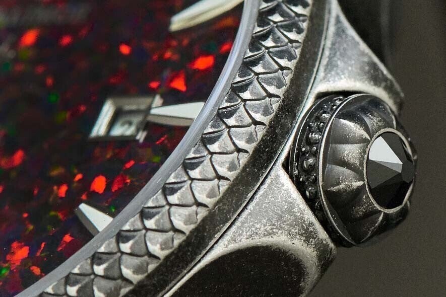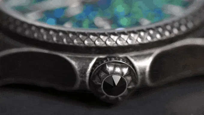 目を奪う輝きを誇るスワロフスキークリスタル(ブラック)をリューズに使用することでアーサー王の王冠の輝きを表現しています。