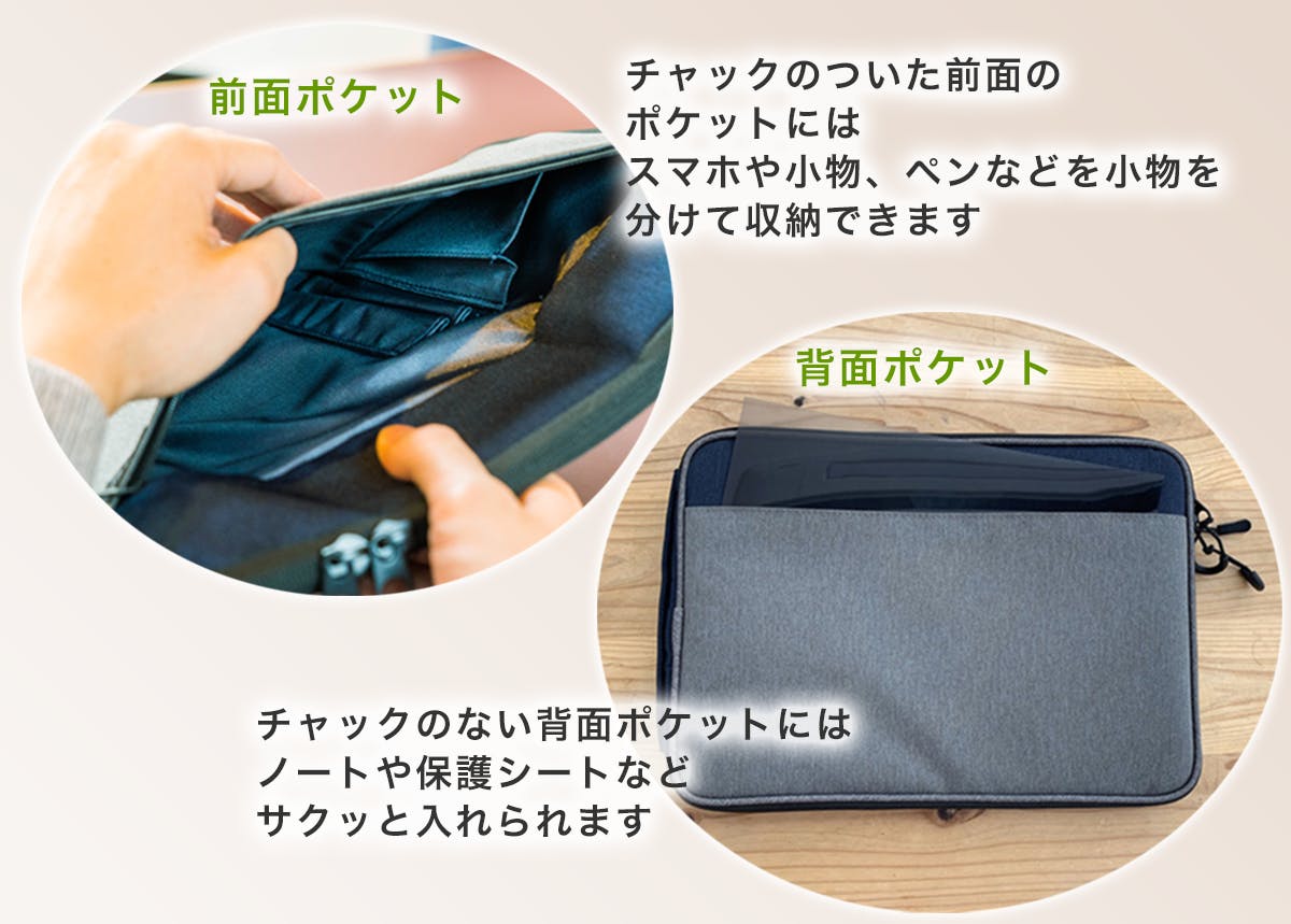 ポケットは前面と背面にあり、PC周りの小物をまとめて収納できます。