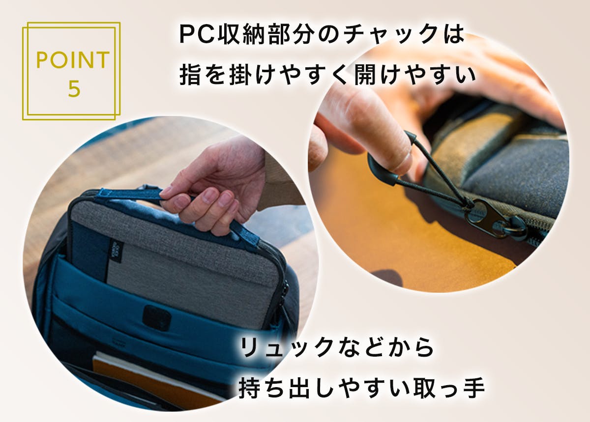 ピークラッチには持ち手も付いており、リュックなどに入れた際でも、スムーズに取り出せます。PC収納部分のチャック引き手は指を掛けやすい設計です。