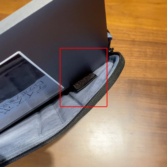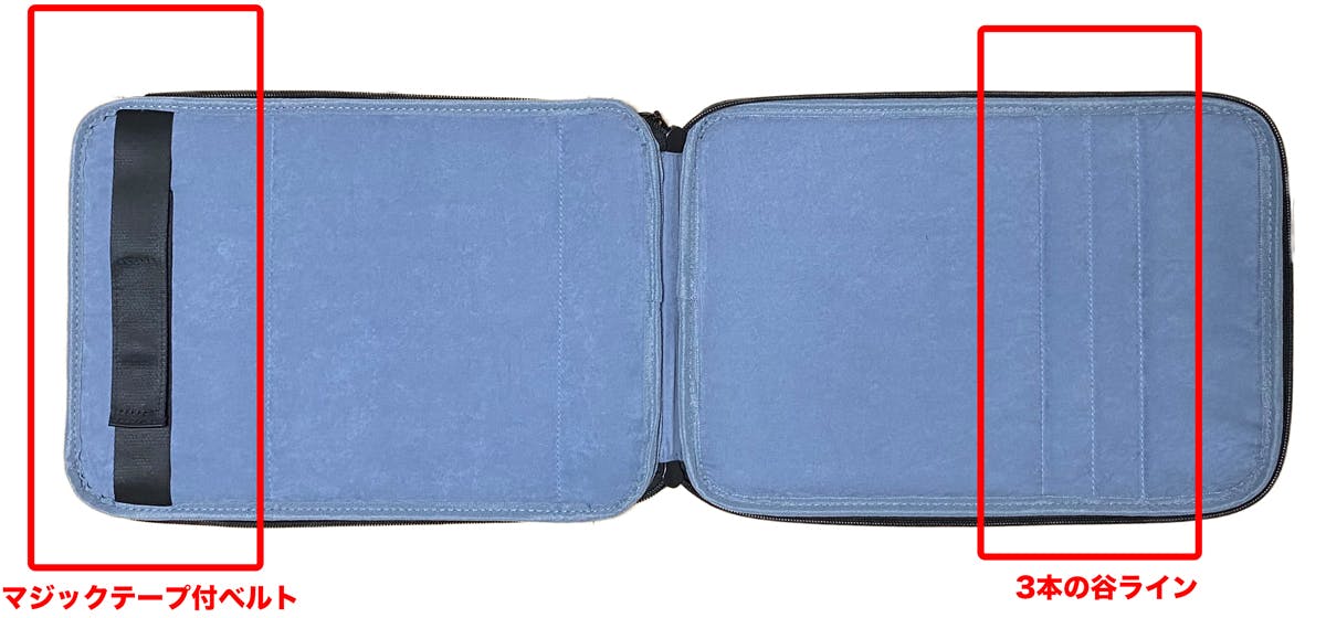 ※ノートパソコンを収納する際、入れ方によってはマジックテープ付ベルトにPCが引っ掛かり、収納されにくい場合もございます。その際はベルトを手で押さえながら、収納いただきますようお願い致します。