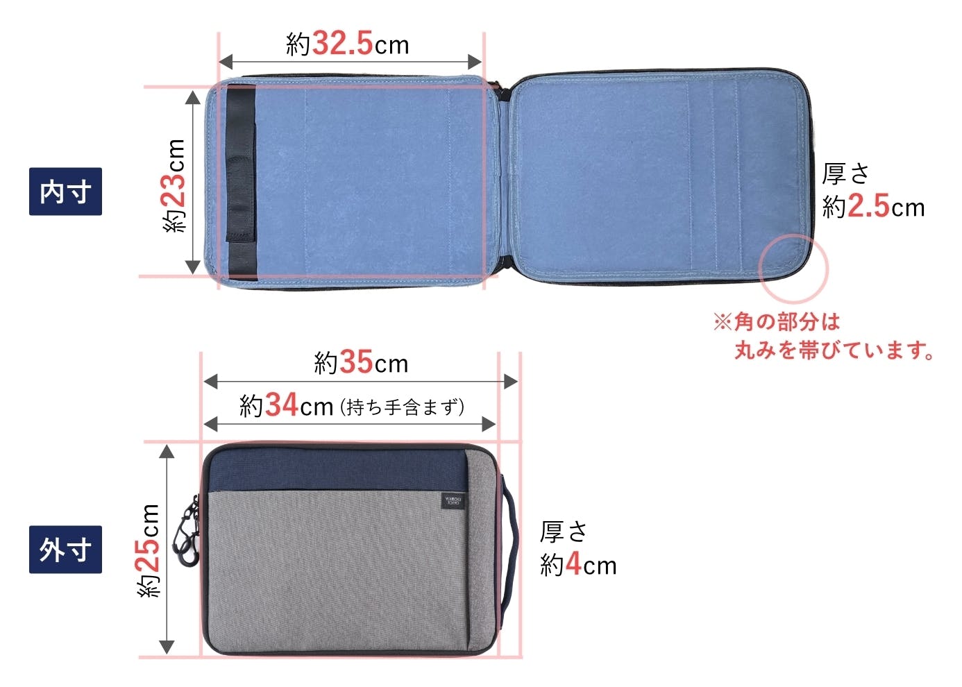 外寸 縦約25cm x 横約34cm(持ち手含まず)約35cm(持ち手含む) x 厚さ約4cm