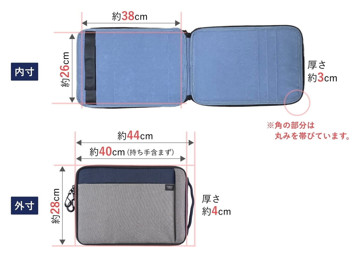 外寸 縦約28cm x 横約40cm(持ち手含まず)約44cm(持ち手含む) x 厚さ約4cm
