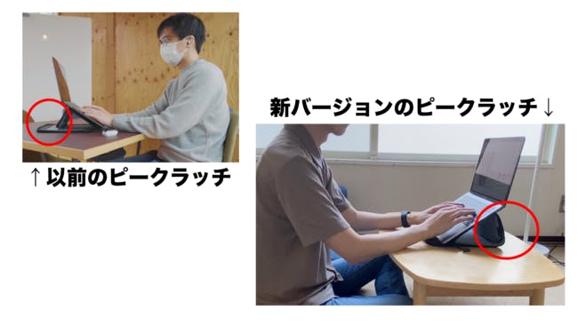 ※ソファーなど安定した椅子にて、ピークラッチを閉じた状態で膝置きにお使いいただく際は、PC本体の発熱や熱のこもりによる低温やけどにはご注意ください。長時間膝置きにてご使用いただくのは避け、健康に気を付けてご使用ください。
