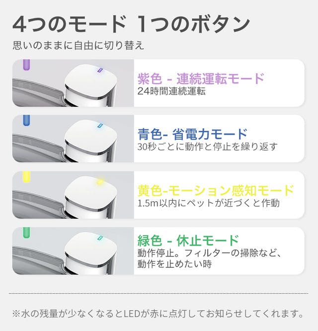 A:はい、可能です。センサー上部のLEDが現在のモードを示しています。連続運転モード(紫色のライト)に切り替えるとALNPET+が水を循環し続け、同時にUVCライトと4in1フィルターで不純物をろ過します。あなたのニーズやペットにとって最適なモードに切り替えてください。