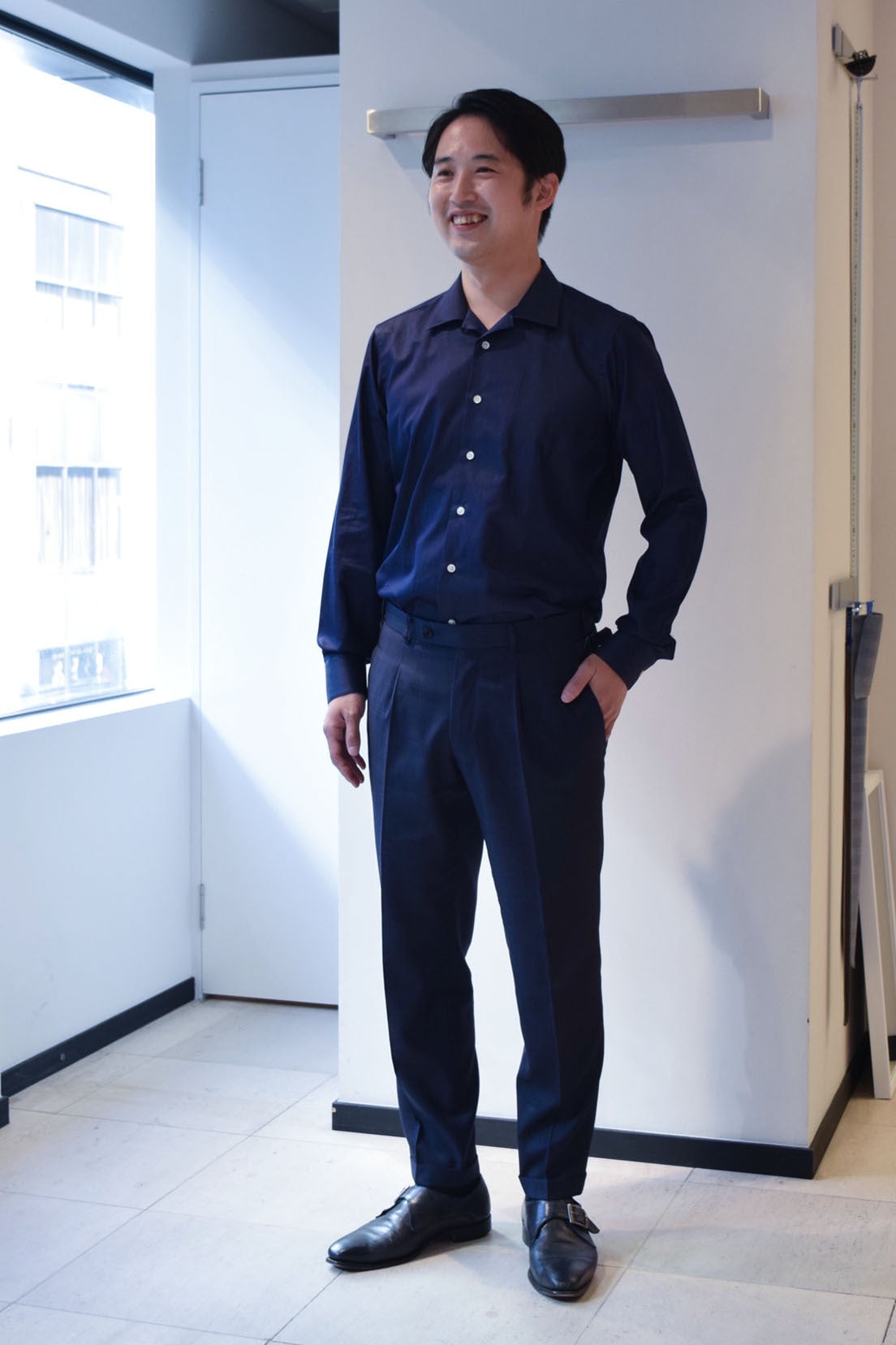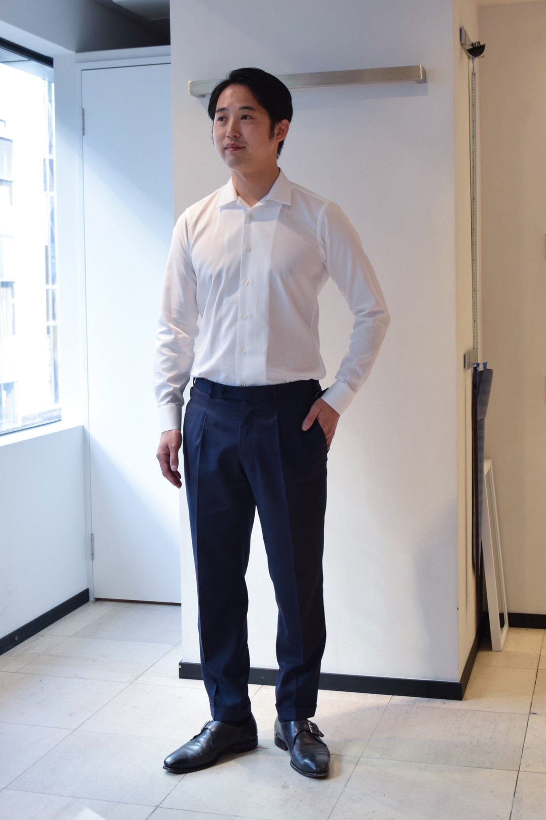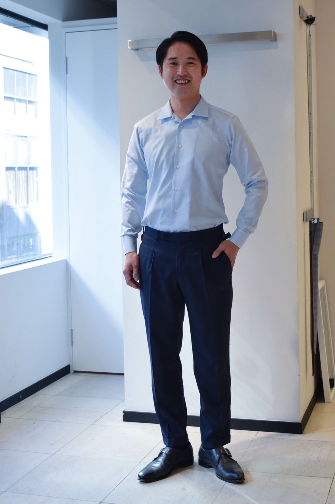 仕事の日は毎日ビジネスシャツを着ています。サイズ感はタイトフィットよりもレギュラーフィットが好みですね。カジュアルウェアはセレクトショップで買い物をする事が多く、BEAUTY&YOUTHではMサイズを購入します。またカジュアルシャツを購入する際もMサイズを選んでいます。
