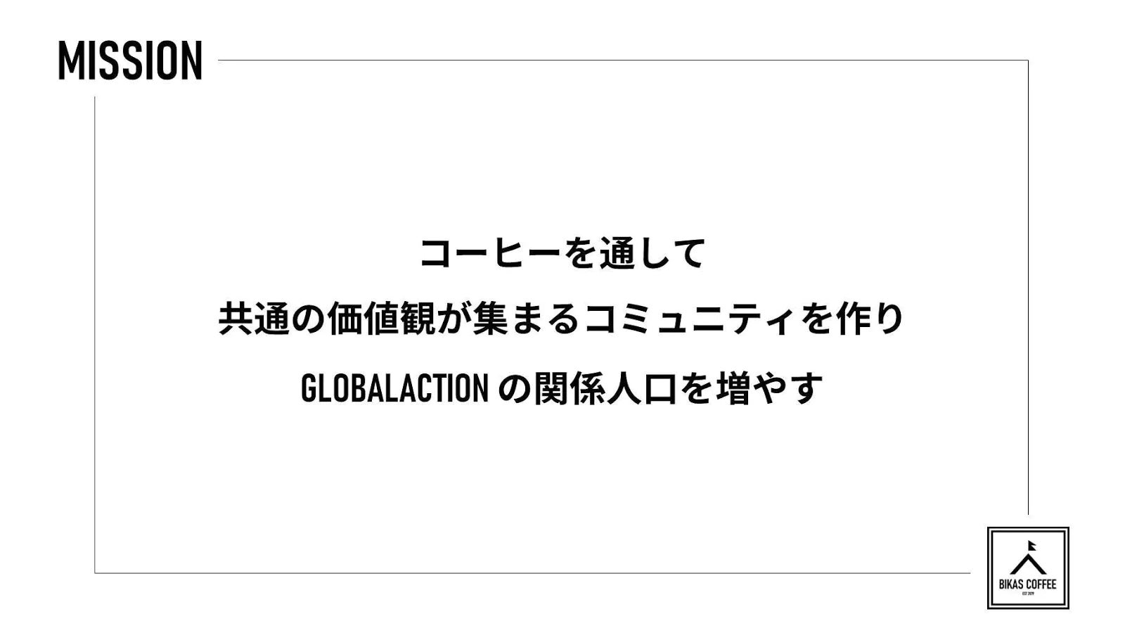 「1日店長」「月間タイアップ」などコラボを行い、それぞれのやりたいことが実現していく場所として活用していただけます。また、当店ではファンのみなさまが生み出したGLOBALACTIONやBIKAS COFFEEのストーリーをオリジナルパッケージにしたコーヒー豆販売を行います。BIKAS COFFEE、皆様のGLOBALACTIONがさらに多くの方に広がる新たな出発点となります。