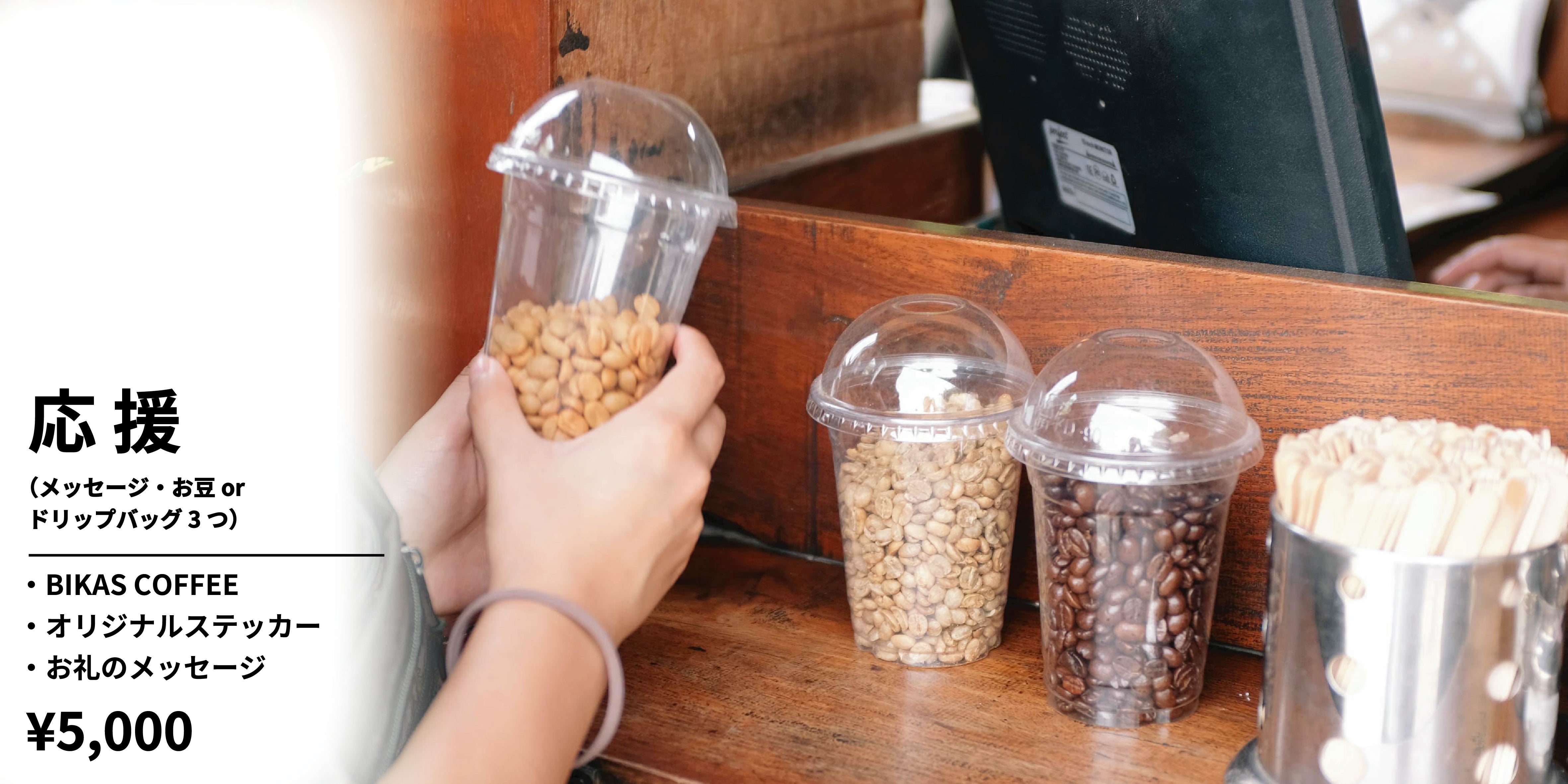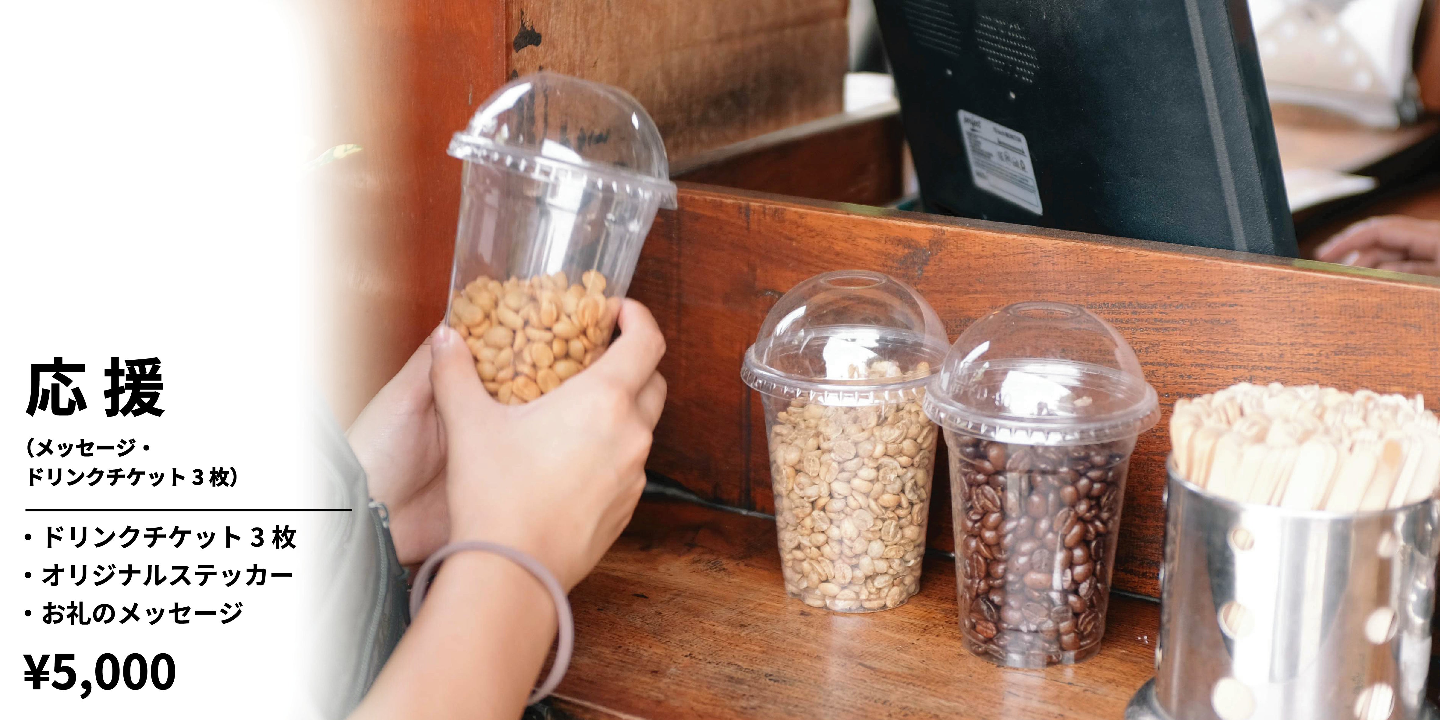 手軽な価格からご参加いただける応援パッケージです。5000円以上のご支援でスタッフからのお礼のメッセージに合わせて、ご自宅で楽しめるお豆、もしくは店頭でドリンクが一杯無料になるチケットなどが届きます。
