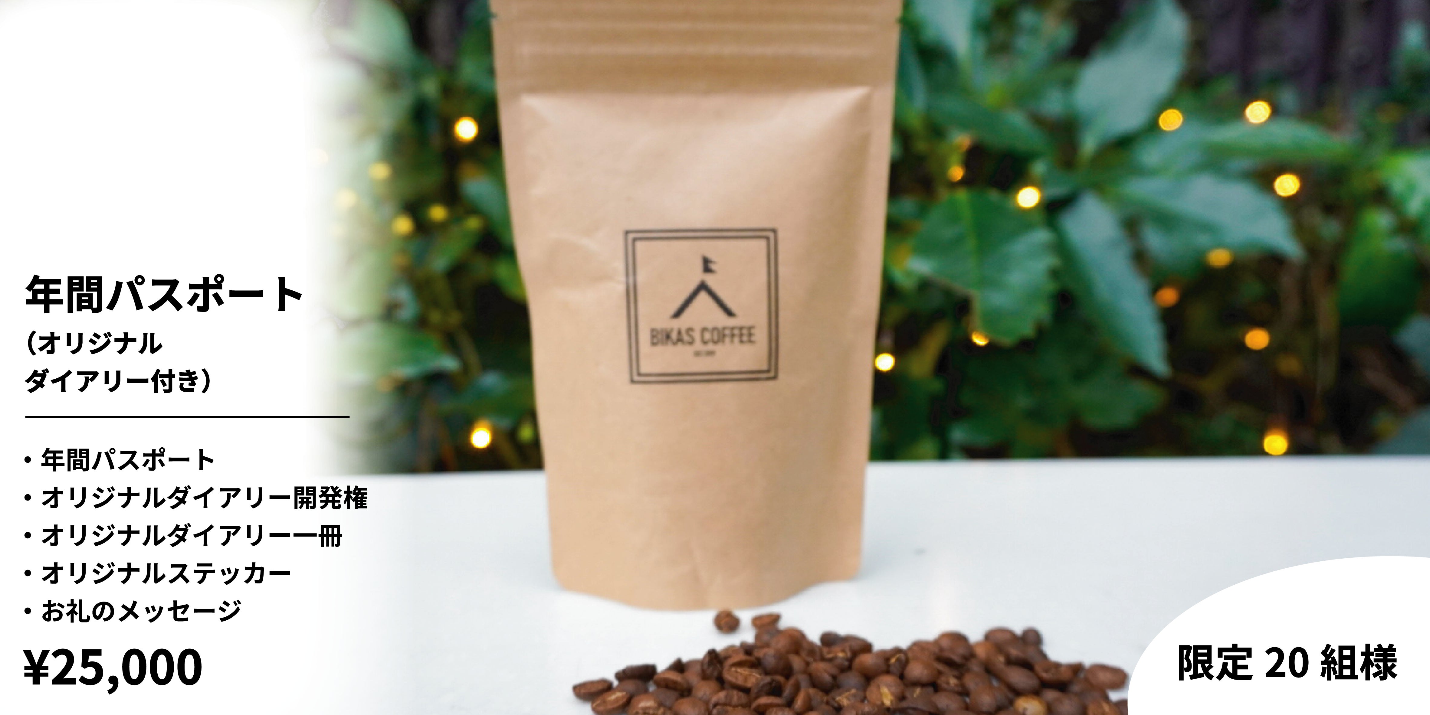 20名様限定!1年間、1日1杯のBIKAS COFFEEを無料で楽しんでいただけるチケットです!思う存分カフェを日常使いしてください!また、年パス保持者の方々には、BIKAS COFFEEオリジナル「ミライ」を切り開くダイアリーを共に開発し、一番初めにお渡しいたします。BIKAS COFFEEに溢れる日常をお楽しみください。
