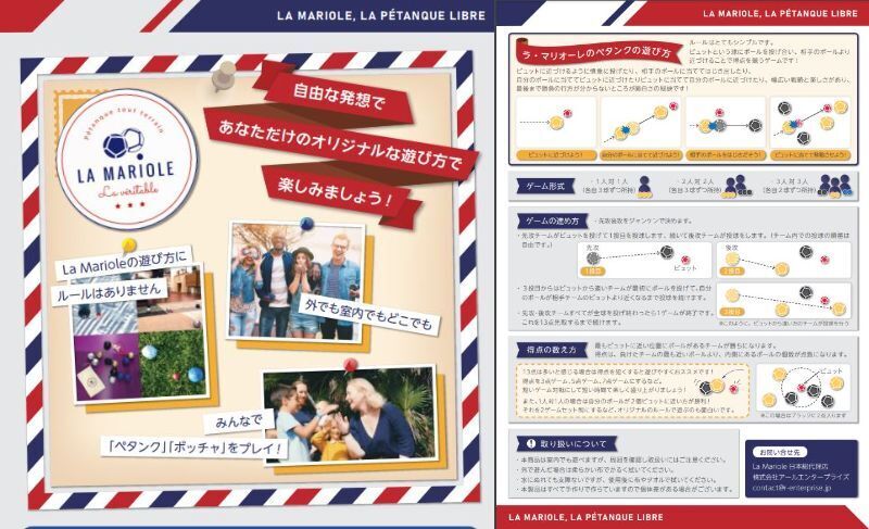 「お客様に感動と好奇心を提供する」ことを経営理念とし主に海外製品のゲームを発掘し、日本へ販売展開しています。特に性別年齢、体力に関わらず誰もが一緒に楽しめるゲームの販売・ゲームから生まれる楽しい!共有体験を提供しています。ラ・マリオーレのペタンクはまさに当社の理念を反映した商品でございまして、誰もが一緒に楽しめて笑えて、楽しい!を共有できるゲームです。日本でラ・マリオーレのペタンクゲームをたくさんのかたにプレイして頂けることを目標に頑張っていきますのでどうぞよろしくお願いします!