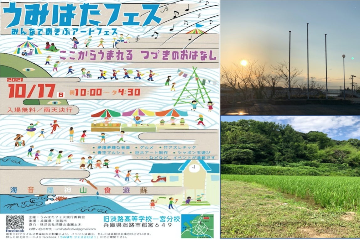 うみはた フェス実行委員会が淡路島の郡家、旧淡路高校一宮分校跡地にて 開催する野外イベントです。音楽、造形などの芸術を多様な人々と創り上げることを目指したお祭りです。「はた」は「側・そば」の意味を持ち、「うみはた」というお祭りの名前は、「海の側そば(はた)で」「万物が生まれた最初の場所=生みの側そば(はた)で」「人や自然の側そば(はた)で」一緒に生きていることを感じられる日になるようにと願いを込めて付けました。「側そばにいる」ことが憚れ、人と物理的距離をとる事が必要とされている昨今、多くの不安や混乱が起こっています。そうした苦境の中だからこそ、人との距離感を丁寧に考えたり、人の心が近くに感じられた時に、今まで以上に湧き上がる喜びやエネルギーを感じられることへのきっかけを作る目的で開催します。