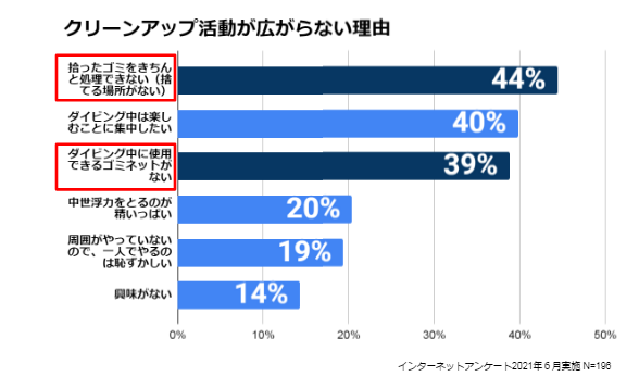 ダイバー(経験者含む)を対象にしたアンケートの結果によれば、最も多かったのは「拾ったゴミをきちんと処理できない(捨てる場所がない)」という理由で、続いて「ダイビング中に使用できるゴミネットがない」という理由でした。そこで、こうした問題を解決するためにこのプロジェクトを立ち上げました。