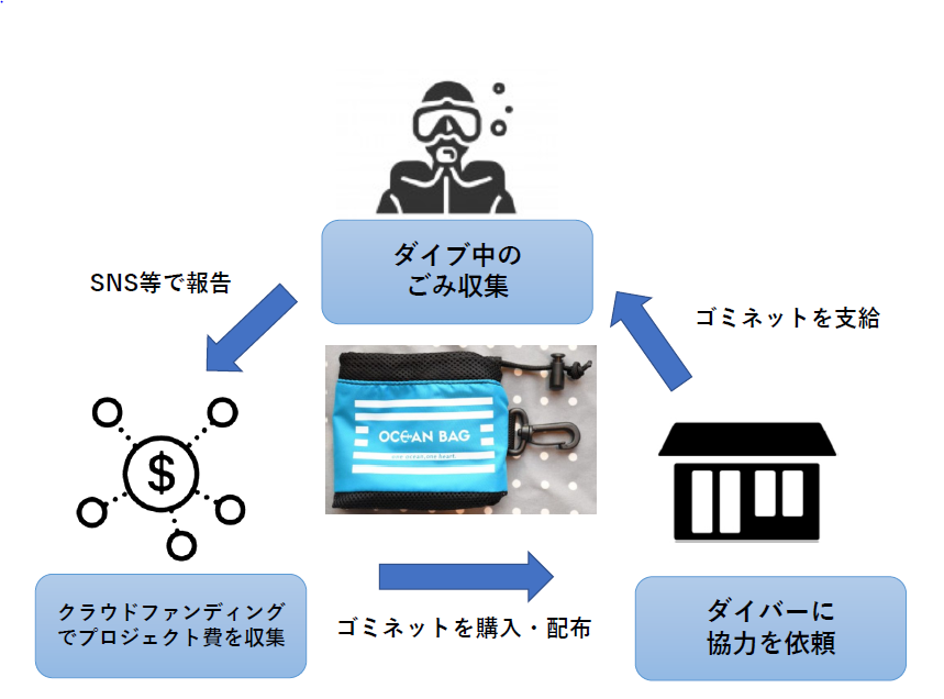 ダイバーの海のために何かしたいという気持ちとダイバーにできること、そしてダイバーでない人の海に対する気持ちをつなげ、社会全体で海のゴミ問題に取組める仕組みづくりができないかと考えました。