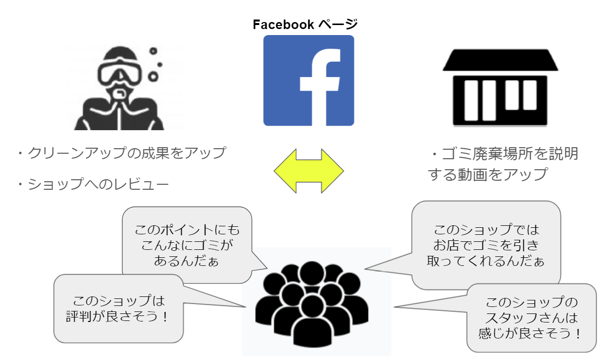 - ・ダイビングショップさんには、ダイビング後にどのようにゴミを処理したらよいか説明する動画をプロジェクト専用Facebookページ上にアップしてもらいます。一方、ダイバーには、ダイビング終了後にクリーンアップ活動の内容とショップレビューをプロジェクト専用Facebookページ上にアップしてもらいます。