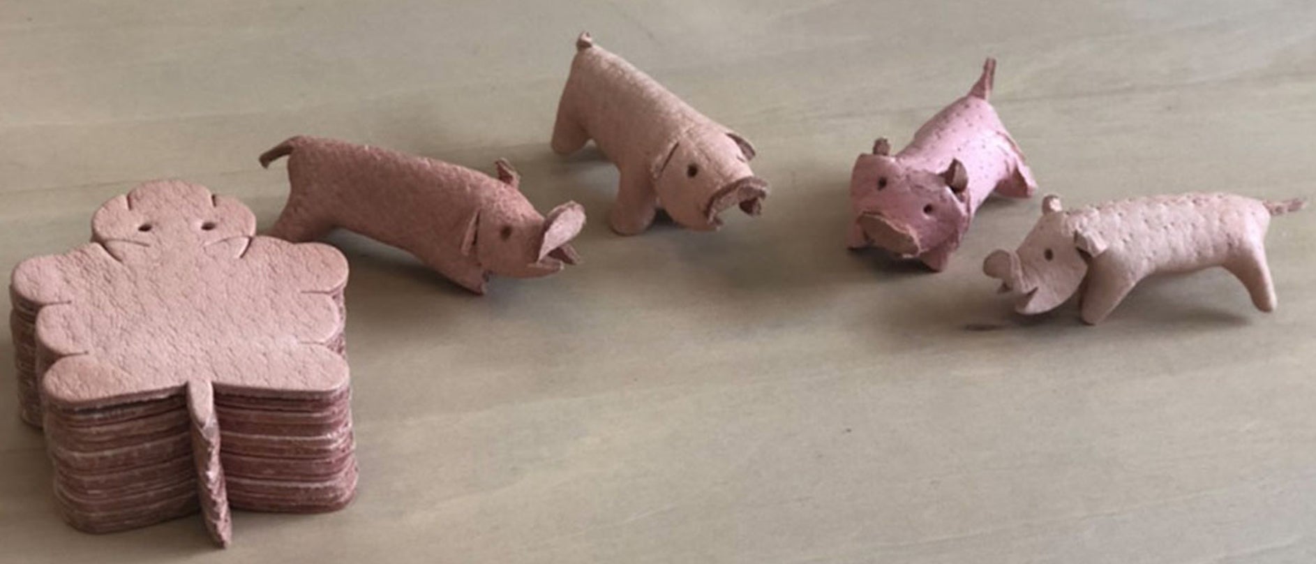 『豚革コースター』『豚ヌメ革の豚さん』『豚革看板』の加工をしていただきました。