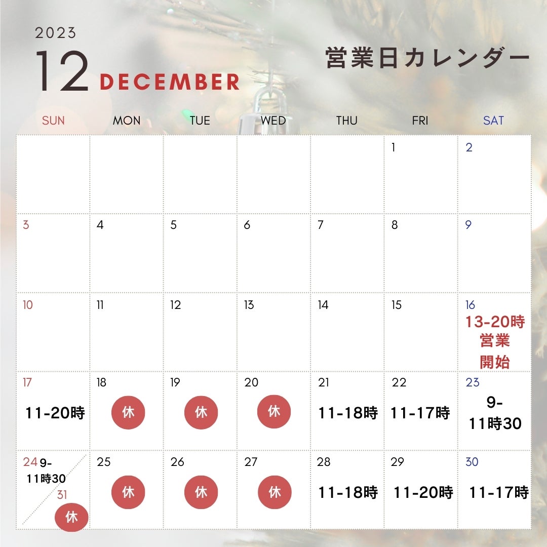 遅くなりましたが12月、1月の営業日が決まりました!