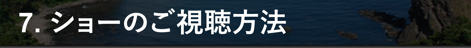 「晩酌ショータイム能登」におけるショーは、リアルタイムで行われるライブパフォーマンスではなく、録画済みのショー映像となります。開演時間は固定されておらず、皆様のご都合に合わせお好きな時間にご視聴を始めていただくことが出来ますのでご安心ください。