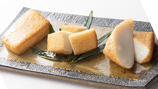 与作揚げ・焼チーズ:厳選したタラとのど黒のすり身で、ふんわりとなめらかな口当たりに仕上げた「与作揚げ」。 ぷりぷりの食感の板かまぼこにチーズを入れて蒸し焼きにした「焼チーズ」。土産品コンクールにて「石川県知事賞」を受賞した自信作です(賞味期限:冷蔵10日)。