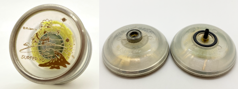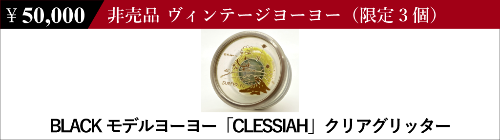 BLACKモデルヨーヨー「CLESSIAH」クリアグリッター: 2004年から2005年にかけて米YoYoJam社より販売された、BLACKモデルヨーヨー「CLESSIAH」。当時は白色、限定の大理石色の2色のみが展開されていましたが、工場の手違いでクリアグリッター(ラメ入り透明色)が少量生産されていました。当時は混乱を避けるため全数をBLACKが買い取りましたが、本企画の御礼品としてお送りさせていただきます。限定3個、ヴィンテージ品につき経年劣化等はご了承ください。