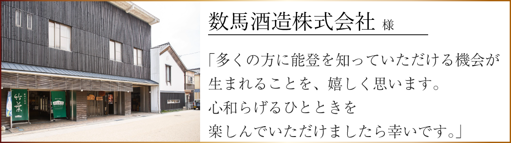 同じく能登で生業を営む、株式会社スギヨ様よりお声掛けいただき、より多くの方に能登を知っていただける機会が生まれることを、嬉しく思います。 この取り組みを通して能登の魅力を感じていただき、能登を好きになってくださる方が増えることを願っております。