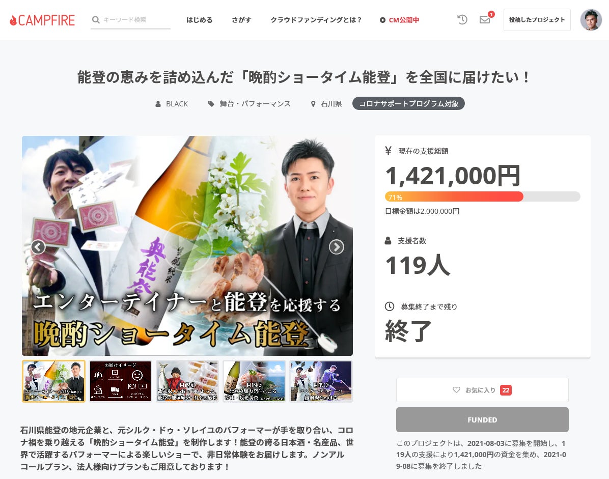 「晩酌ショータイム能登」制作プロジェクト、クラウドファンディングの募集期間が終了しました。