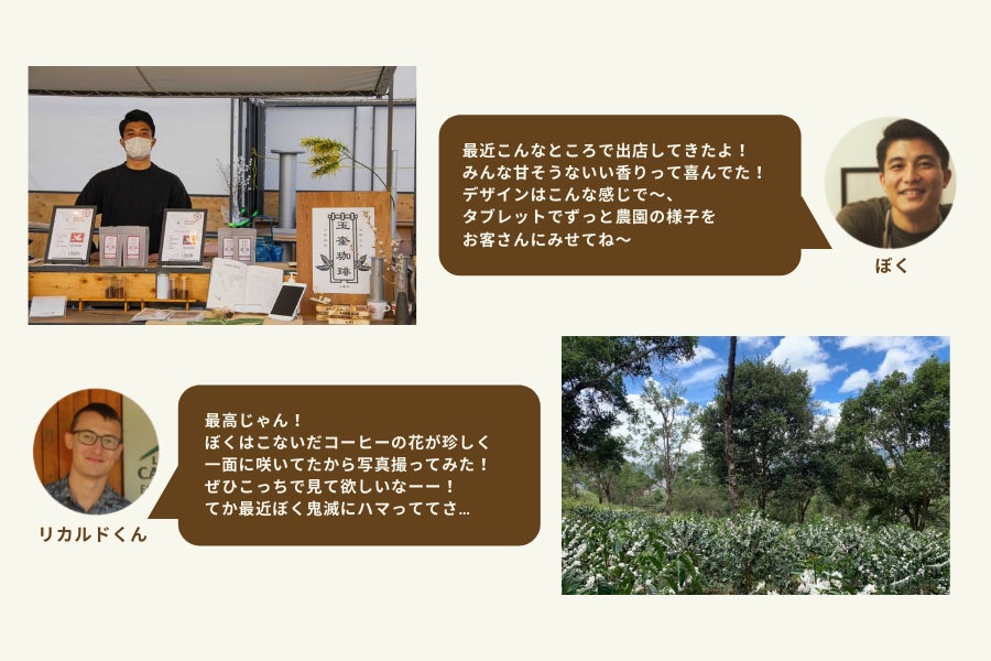 帰国後も、生産国・消費国の立場からそれぞれが見ているコーヒーの世界についてコミュニケーションを続けるようになり、ぼくは焙煎や出店の様子、リカルド君は農園や精製所の様子などを頻繁に伝え合う関係になりました。