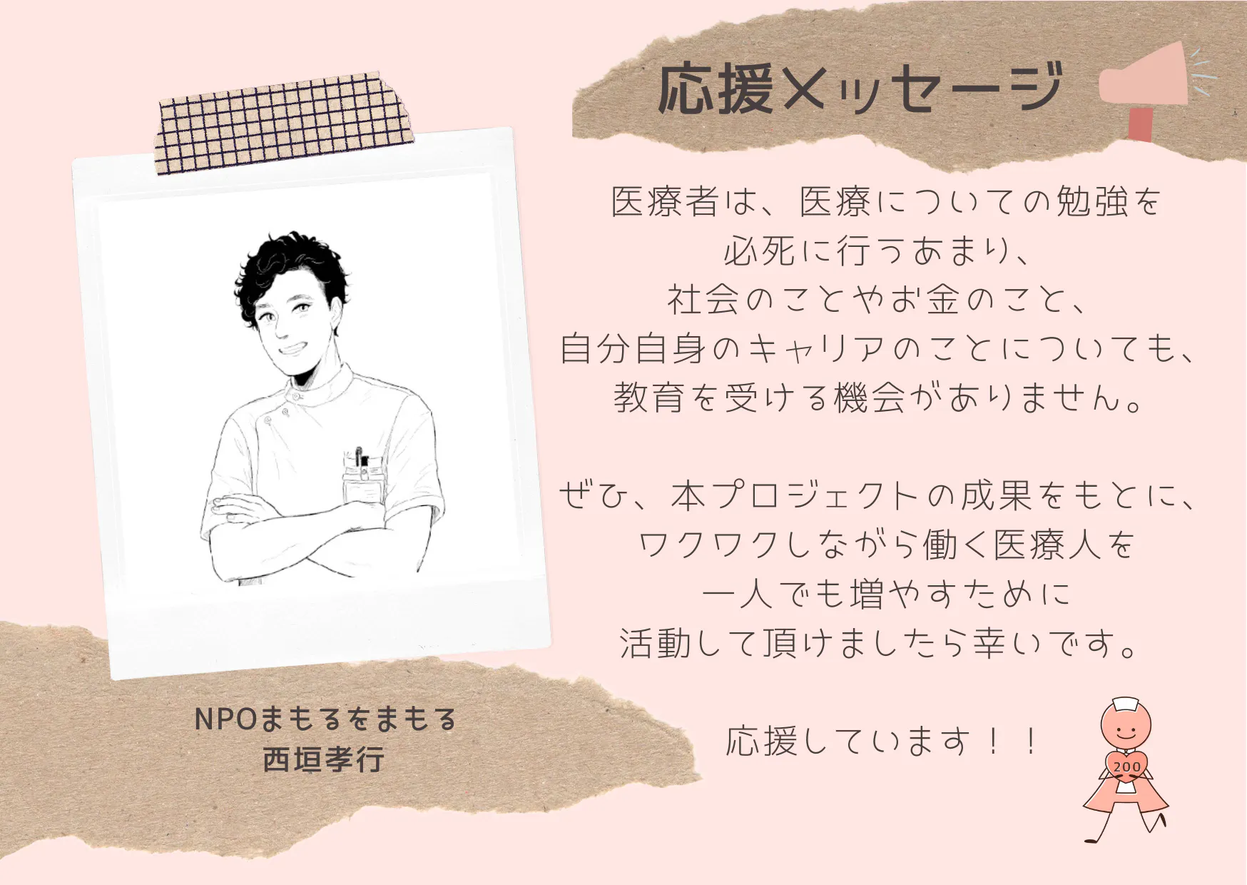 2021/11/10 18:48医療者は、医療についての勉強を必死に行うあまり、社会のことやお金のこと、自分自身のキャリアのことについても、教育を受ける機会がありません。ぜひ、本プロジェクトの成果をもとに、ワクワクしながら働く医療人を一人でも増やすために活動して頂けましたら幸いです。応援しています!!NPOまもるをまもる西垣孝行https://mamoru2.com/index.html応援ありがとうございます!このプロジェクトを通して、自分らしいキャリア選択ができる人が増え、ワクワクしながら働けるよう引き続き頑張ってまいります! もっと見る