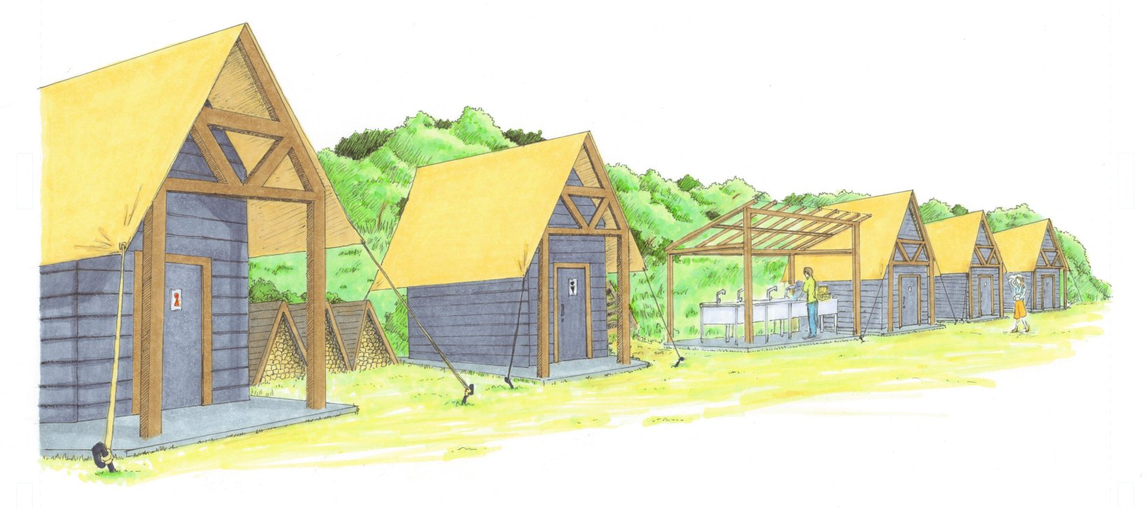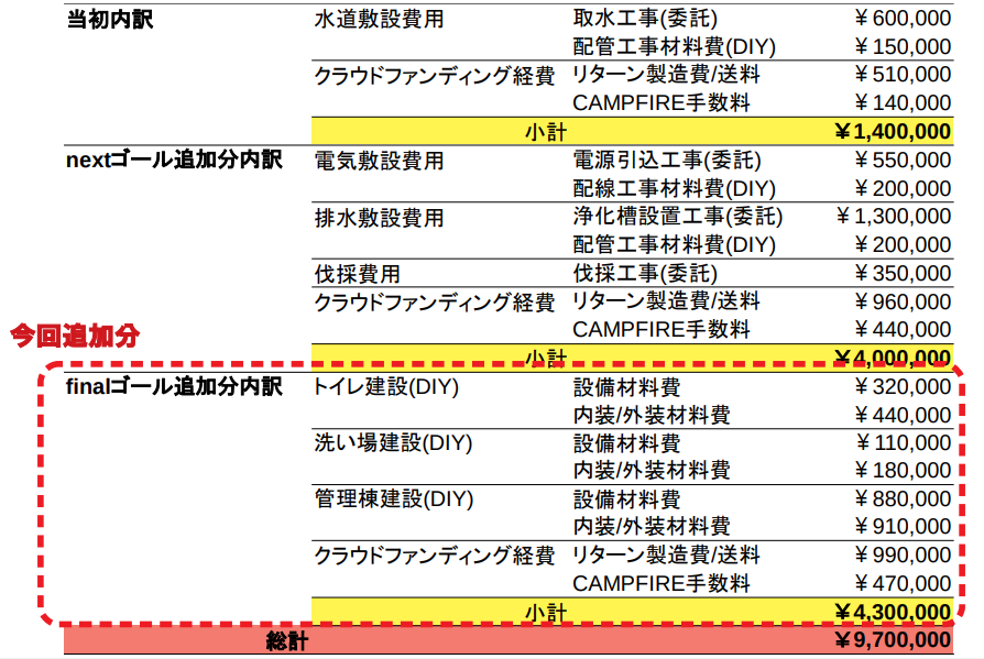 各種建物(トイレ、洗い場、管理棟)のDIY建設費用を賄うための金額として目標設定させていただきました。