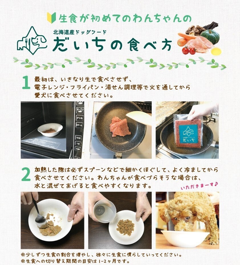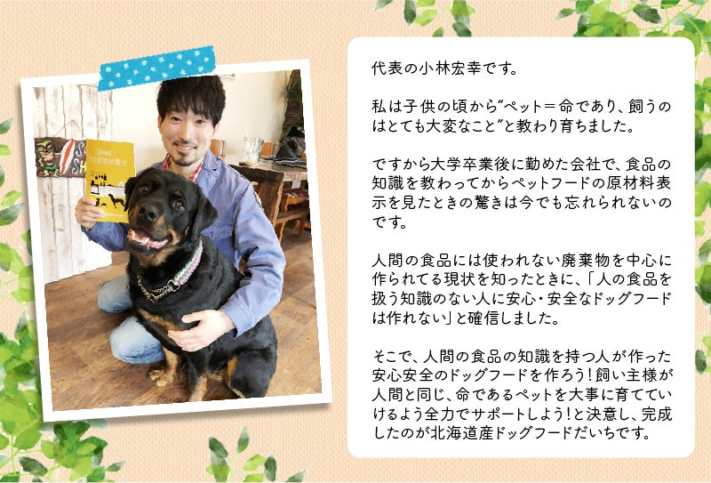そこから、防腐剤、合成保存料、合成ビタミン、合成ミネラルはもちろん、化学調味料、着色料も使用しない上で栄養バランスが良くなるような厳選した食材で作った北海道産ドッグフード「だいち」が完成しました。