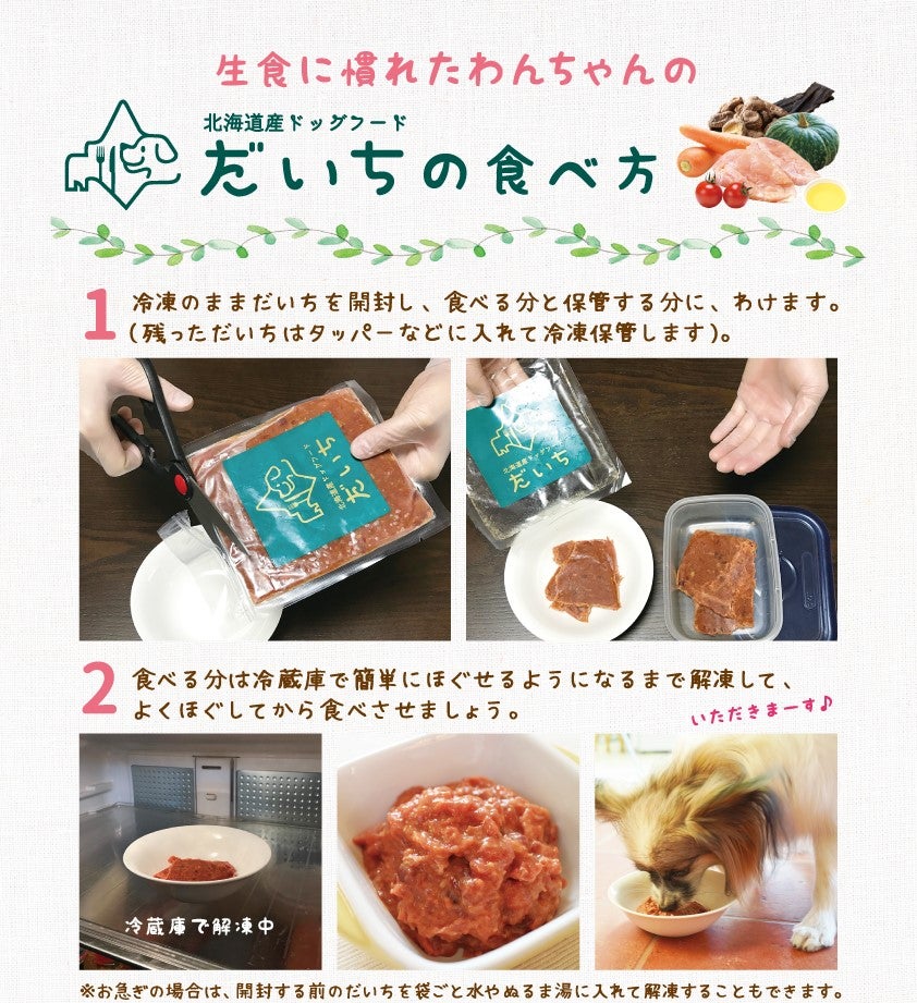 調理する時は解凍して、愛犬の体調に合わせて生か加熱した状態どちらかを飼い主さんが選んで食べさせることが出来ます。