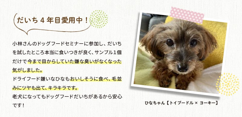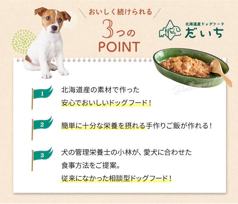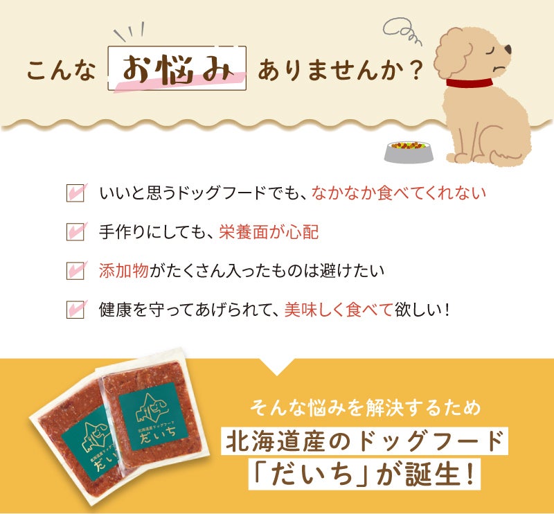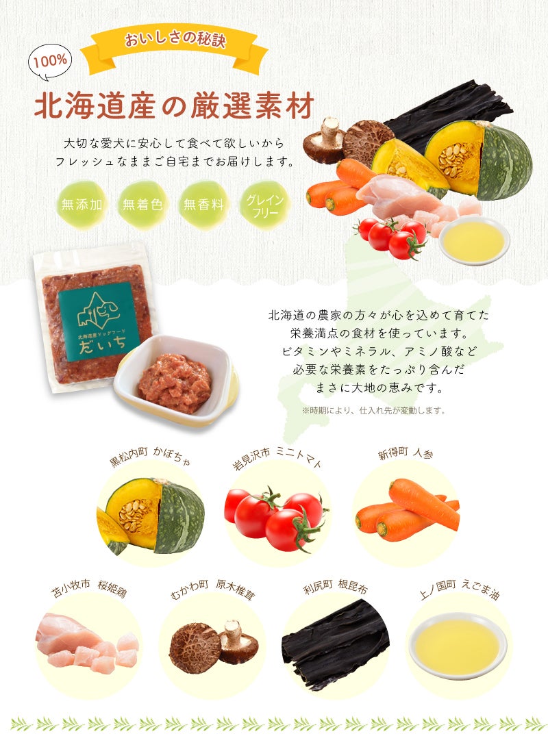 そこから、防腐剤、合成保存料、合成ビタミン、合成ミネラルはもちろん、化学調味料、着色料も使用しない上で栄養バランスが良くなるような厳選した食材で作った北海道産ドッグフード「だいち」が完成しました。