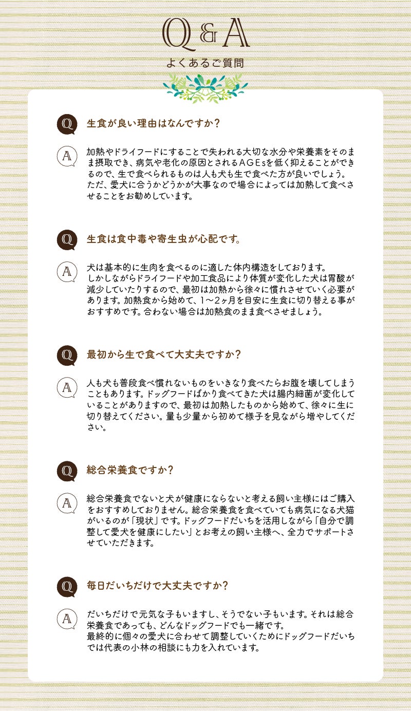 毎日同じドッグフードと水だけで大丈夫という総合栄養食のフードと考え方が異なり「自分で調整して愛犬を健康にしたい」というコンセプトで「だいち」は開発されています。