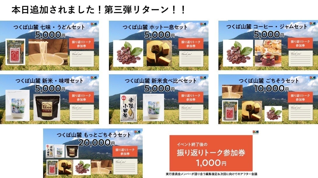 つくばの物産と観光にも少しでも循環させたい、と金曜日のライブ配信で発表したリターン品の第三弾も公表をいただいております。