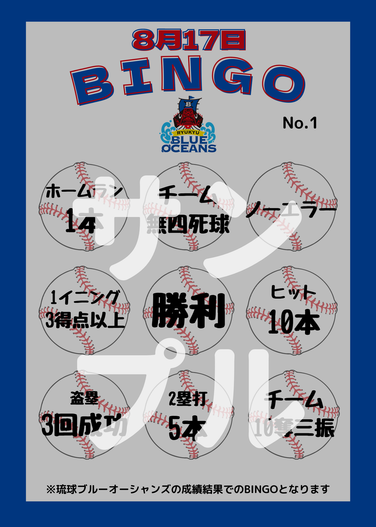 試合結果、琉球ブルーオーシャンズの成績に応じご自身でBINGOカードにマーカー等でチェックしていただき、BINGOされた方は、写真画像またはPDFにて名前、住所をご記入の上、『bingo@ryukyu-blueoceans.jp』まで試合終了後3日以内にお送りください。