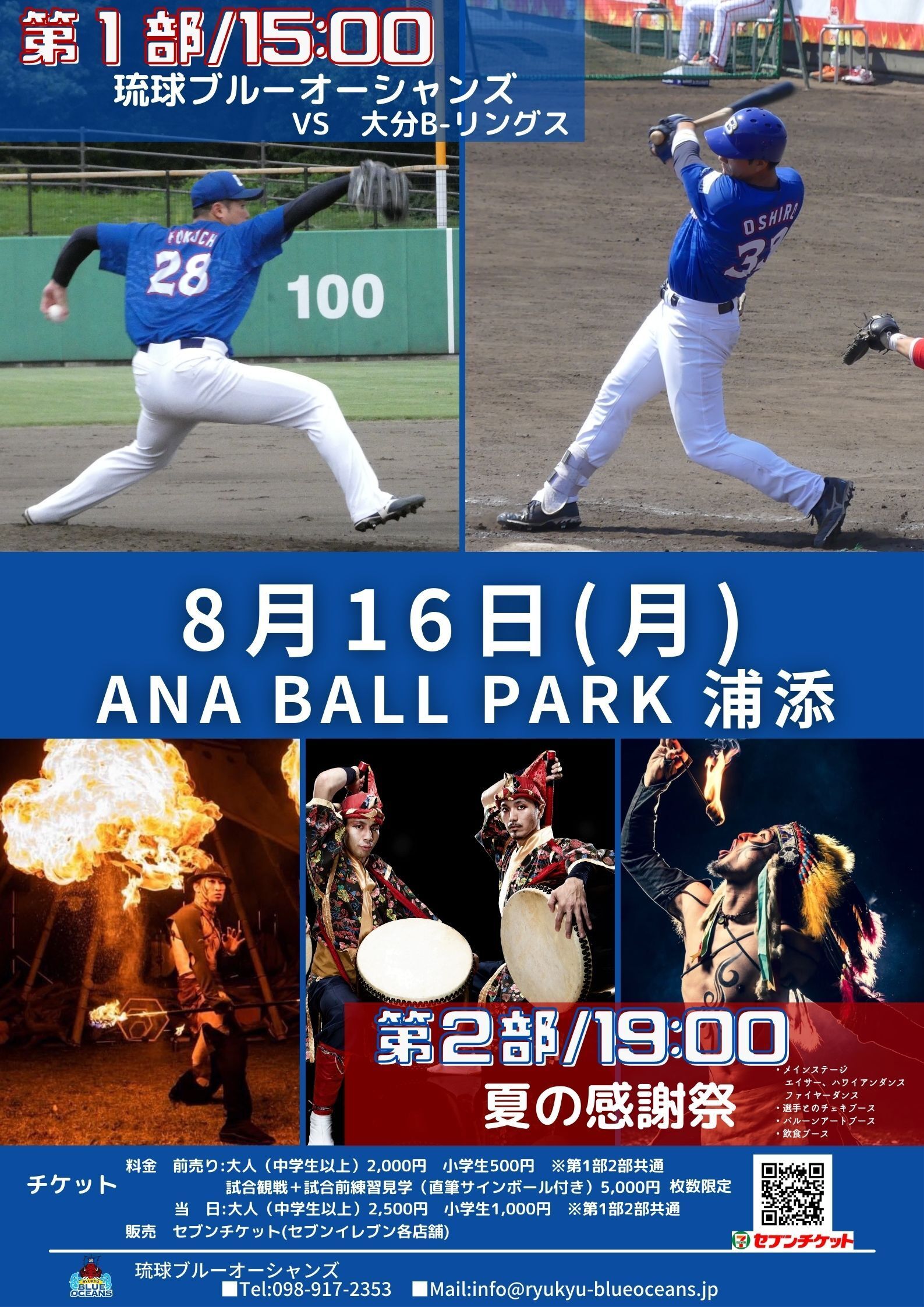 16日17日は、試合後、『夏の感謝祭』と銘打ちましてファイヤーダンス、エイサー、フラダンスショーの3つのショーパフォーマンスに加え、選手と写真が撮れるチェキブース、バルーンアート、飲食ブースなどを球場内にてお楽しみいただけます。