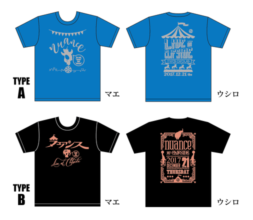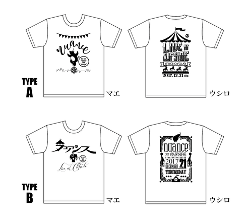 【リターンのTシャツデザイン発表!】 おまたせしました! 「デザイン見てから決めたいよー」の方々を待ちに待たせてスイマセン! Tシャツデザイン2種はコチラ! 記念すべき《クリフサイド》のライブと2nd minialbum《ミライサーカス》をイメージした2種類が出来上がりました!マエにもウシロにもババンッ!とデカデカデザイン! ステキ!カワイイ!オシャレ! うーん。どっちも欲しい! そんな声が聞こえて来て欲しい…(笑)。 Tシャツの生地とデザイン面の色はまだ迷っていますが(!) ライブTシャツっぽく黒の生地になる予定です。 (色は決まり次第アップします) この2種類のTシャツは、このプロジェクトでしか手に入りません! 一般販売は(色違いも)しないので、まさに「レア感」。 ヌューメン(ヌュアンスファン)もこれからの方も、またお友達にも。 「えー!あのTシャツ持ってるの羨ましい〜!」 って思われるアイドルユニットにヌュアンスはなりますよー! みなさんの応援。まってる。