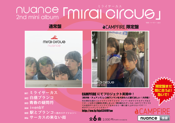 【2nd minialbum ミライサーカス収録曲発表!】 M1ミライサーカスM2白昼ブランコM3青春の疑問符M4i=enbYM5駅とブランコ〜恋のステイション〜M6サーカスの来ない街 全6曲 最近のライブではお馴染みで「早くCD化を!」との声が多かった 「駅とブランコ〜恋のステイション〜」がついに音源化! その他の曲は全部新曲新録音! プロジェクト締め切りまであと12日!多くの人に届きますように!