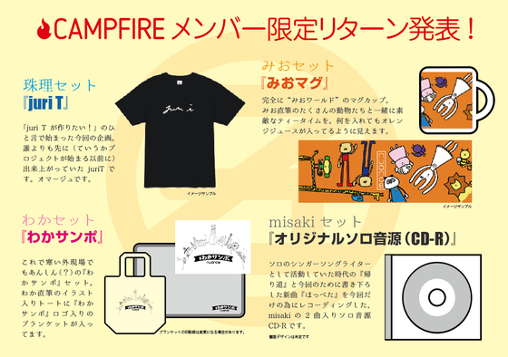 【メンバーオリジナルグッズリターン&チケットデザイン発表!】 おまたせしました! メンバーオリジナルグッズのリターンの内容と限定チケットデザインが出来上がりました! オリジナルグッズはメンバーそれぞれ「手描き(演奏)」! 個性が出るラインナップとなりました。 “juri-T”を着て “わかブランケット”掛けて “みおマグ”にオレンジジュース入れて “misakiの音源”聴きながら 休日を過ごすのが正しい過ごし方です!(笑) 併せて、限定チケットのデザインも完成!ドドンっ! こちらももちろん『ハービー・山口』氏の撮り下ろし! こちらもCAMPFIRE限定リターンのみのフルカラーデザインチケットです。 ステキ写真に負けないくらいステキライブをお届けしますよー! チャレンジ締め切りまであと11日! ワンマンまであと32日! よろしくお願いしますっ!