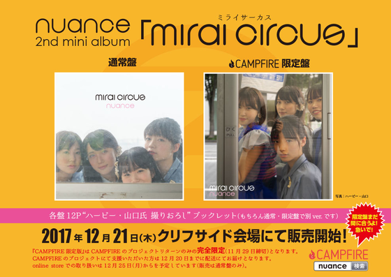 こんにちはヌュアンス制作部です。 たくさんのご支援ありがとうございます! ただいま絶賛2nd minialbumとクリフサイドワンマンに向けてメンバー一同走り回っています! 今週中には皆様にminialbumのタイトルとジャケット写真をお届けできると思いますので、楽しみにしていてください! ちなみに《CAMPFIRE限定》と書かれているものは本当にCAMPFIREのみの商品となります(限定ジャケットは約200枚、Tシャツも限定は通常販売はありません)。なので、GET逃しのないように&周りの『ヌュアンス好きそうだなー』っていう人にもオススメしてくださいー。ワンマンの内容も…。お楽しみに! 引き続きヌュをよろしくお願いします。