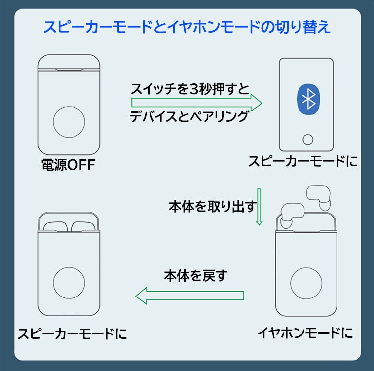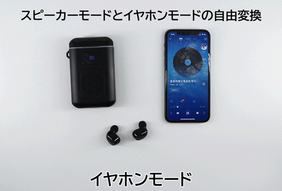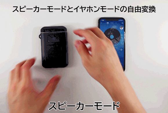 スピーカーモードでは、イヤホンを取り出すとスピーカーからイヤホンモードに変換、もう一度ケースに戻すとまたスピーカーモードに戻ります。