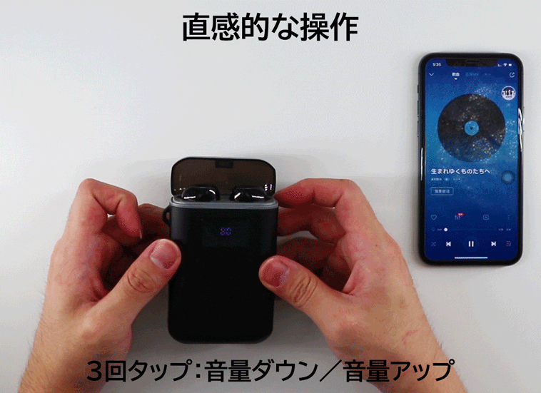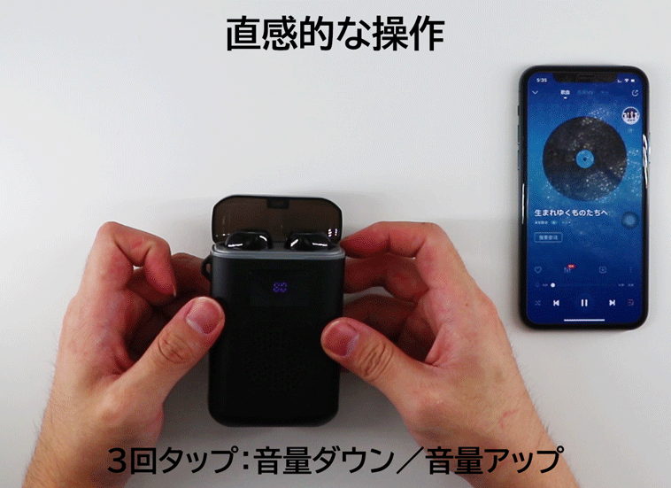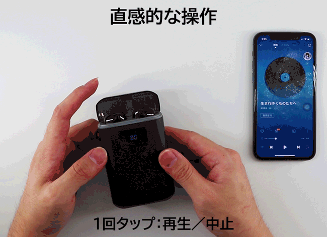 4000mAh磁石式でカチッと充電できる収納ケースは、イヤホンを約40回分フル充電可能、合計使用時間は約220時間となります。さらに、非常時にスマホの予備電源としても使えます。