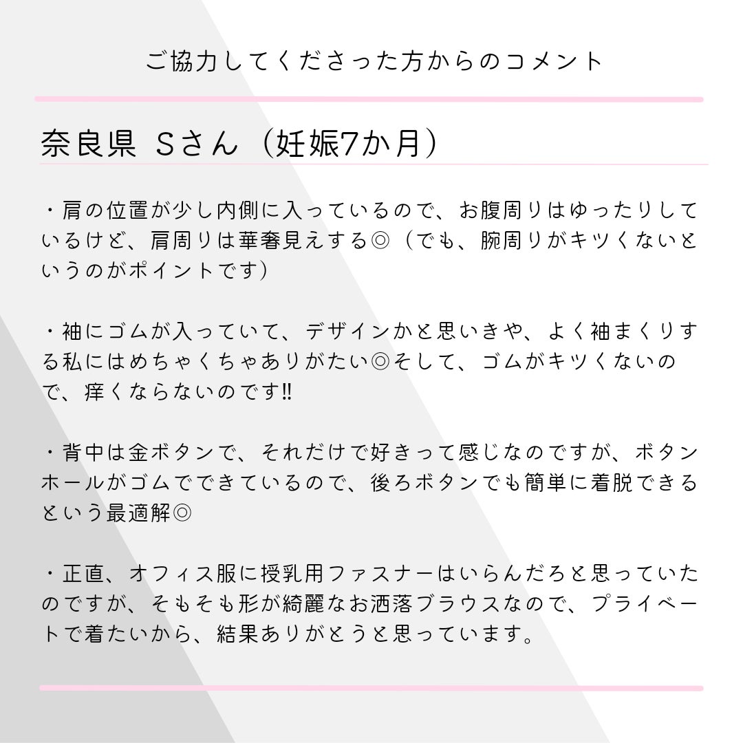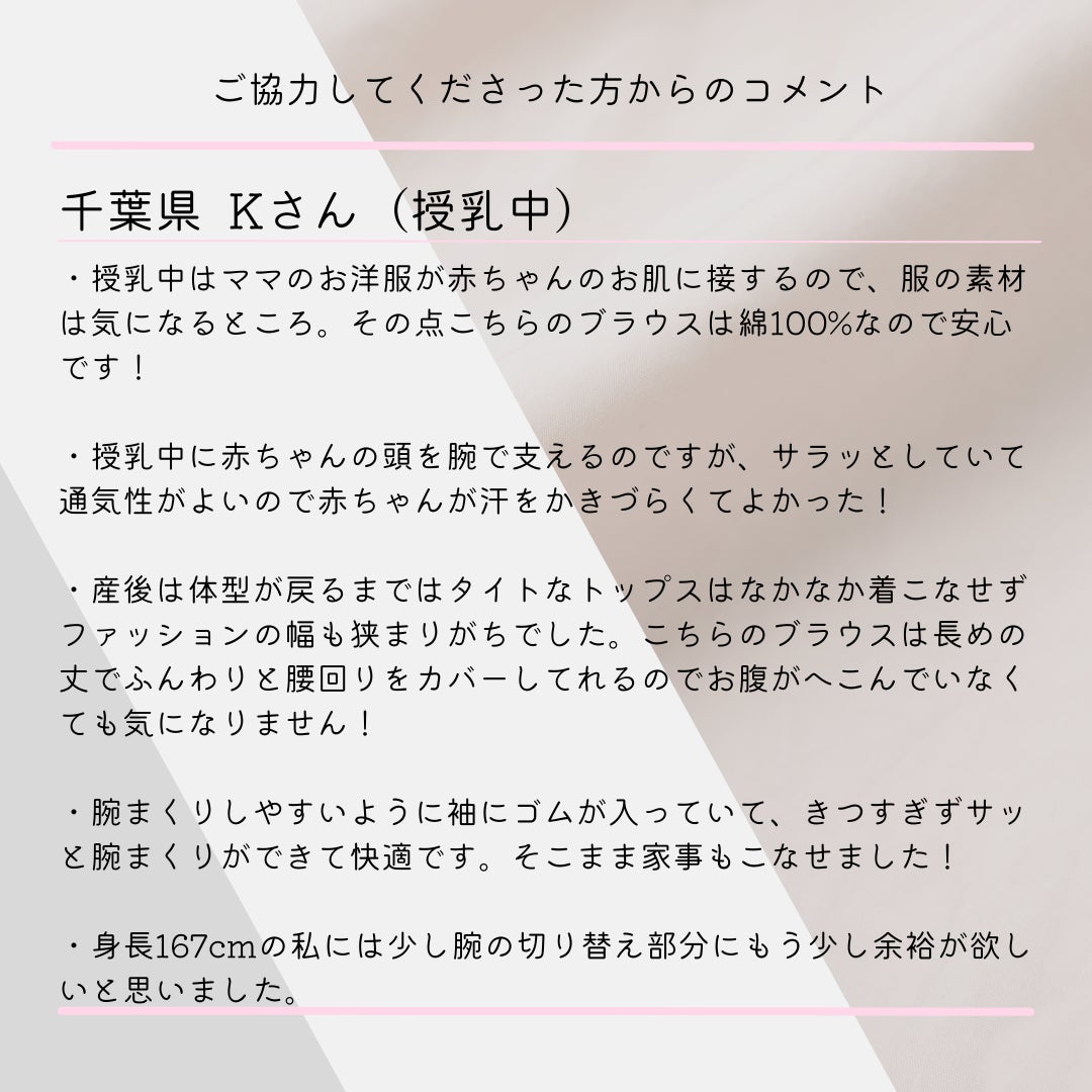 ブラウスを着用していただいた方からコメントを頂きました。新しくコメントが届きましたら随時更新していきますのでご参考して下さい。