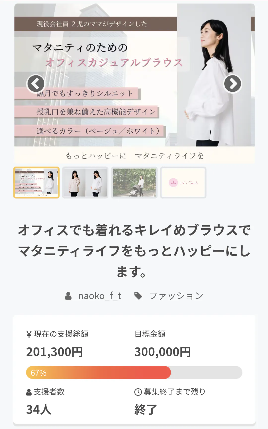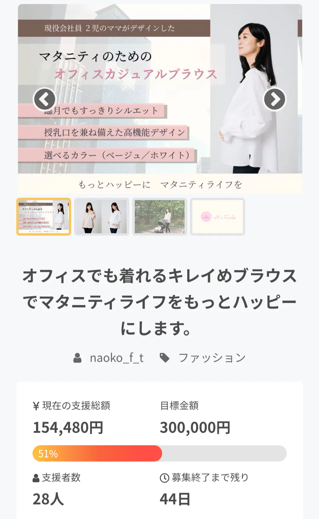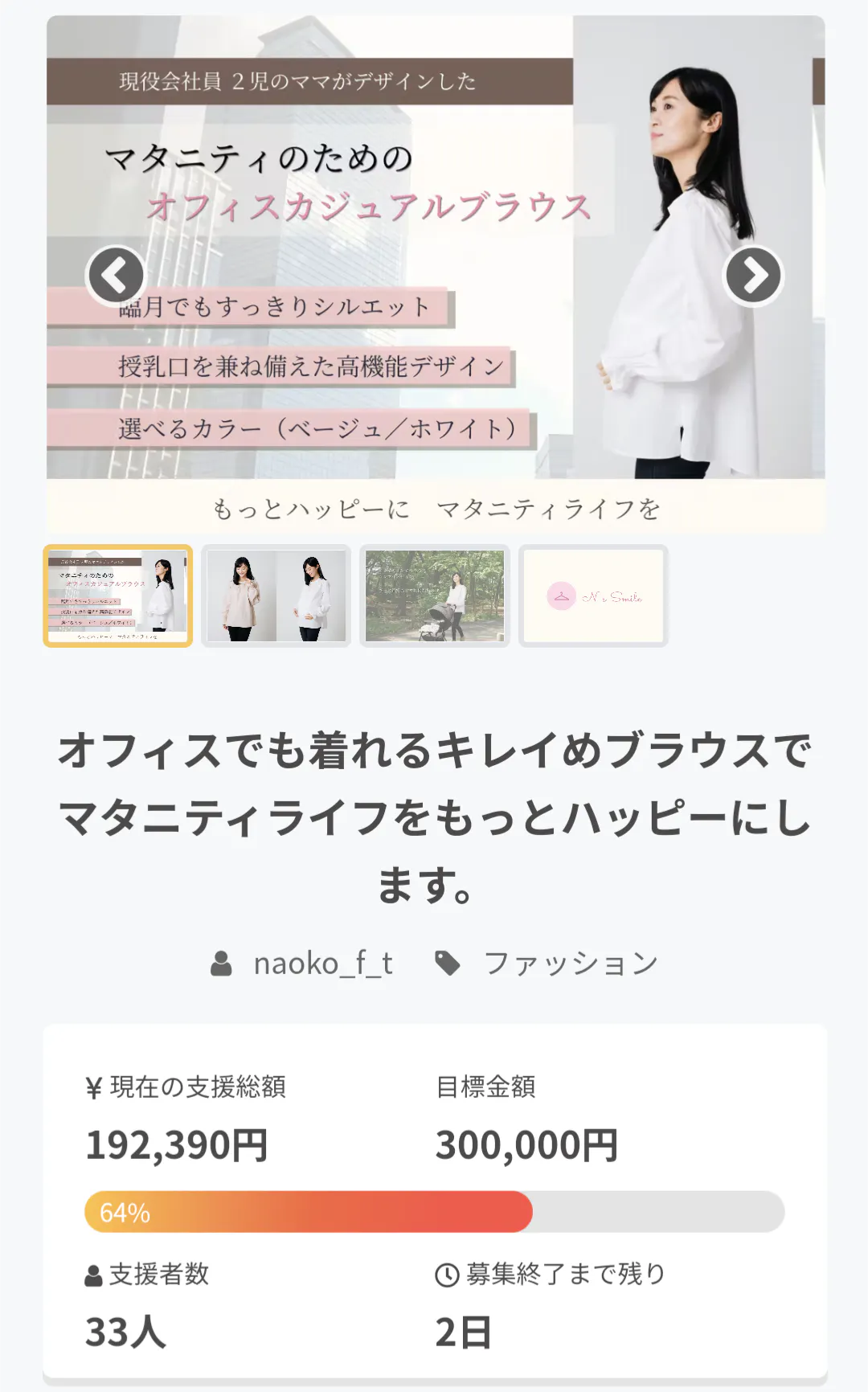 また、このクラウドファンディングを通して、新しいマタニティファッションブランドN's Smile立ち上げの軌跡や、ブランドそのものを知って頂き、新しい働き方を共有したいと思ってます。
