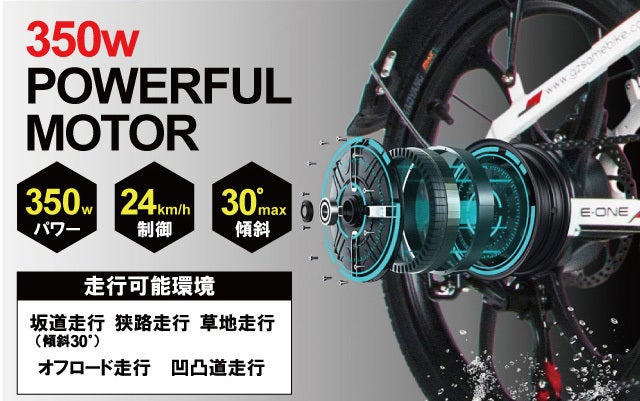 350Wパワフルモーターは、バイクのエンジンに制限をかけているもので、法定速度の24km/hまでのアシストをしっかり守りながら、坂道ではグングン!馬力は本物!