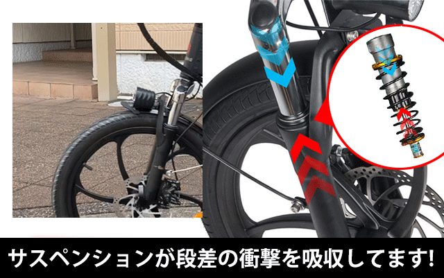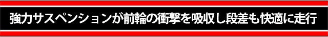 この強力なサスペンションが前輪に受ける衝撃を吸収してくれ、悪路や段差のある道でも衝撃をしっかり吸収し快適に走行できます。