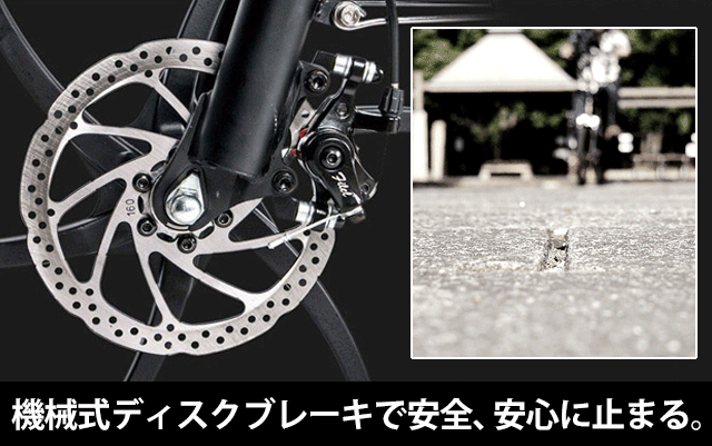 「ブレーキの効きが良い」「ブレーキの音が静か」「僅かな力でブレーキが利く」「性能が天候に左右されない」などしっかりチェックされた高性能な機械式ディスクブレーキを採用。