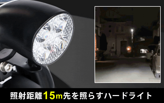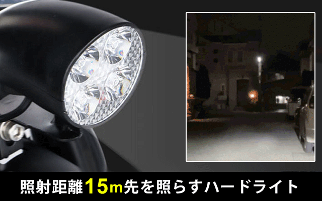 夜道の安全を確保するため、ライトには照射距離15Mのハードライトを採用。