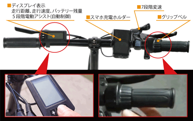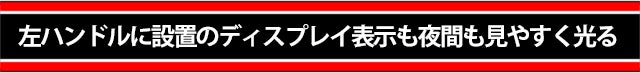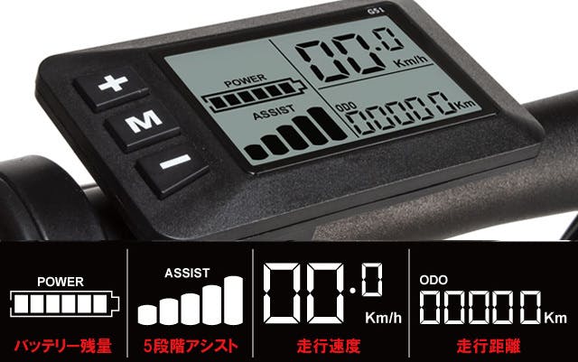 左ハンドルに付いたディスプレイで走行距離、走行速度、バッテリー残量を一目で確認!